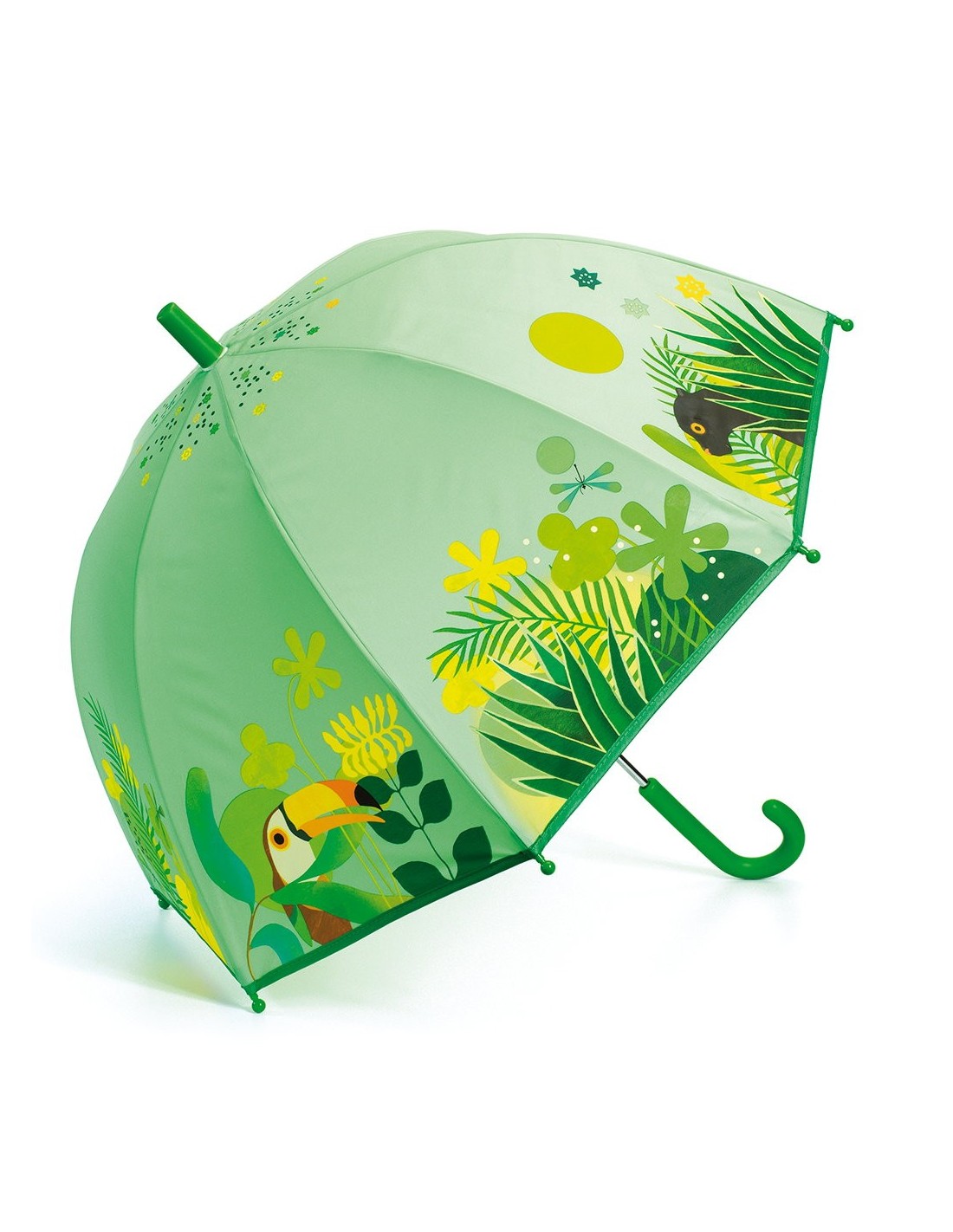 El paraguas Jungla Tropical forma parte de la colección Little BIG Room by Djeco. Ha sido diseñado especialmente para niños y no solo en lo referente al tamaño. Incluye un protector especial en el cierre para impedir que se hagan daño al abrirlo y las puntas de las varillas tienen un recubrimiento redondeado. La edición jungla tropical está basada en tonos verdes y amarillos alegres e ilustrada con motivos de la selva como animales y plantas. El compañero ideal para los días de lluvia!