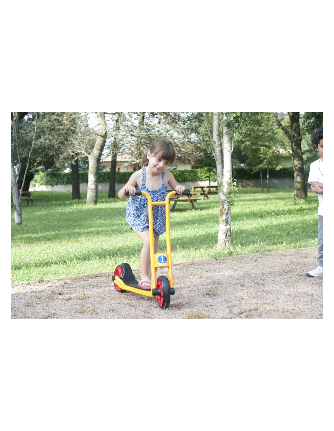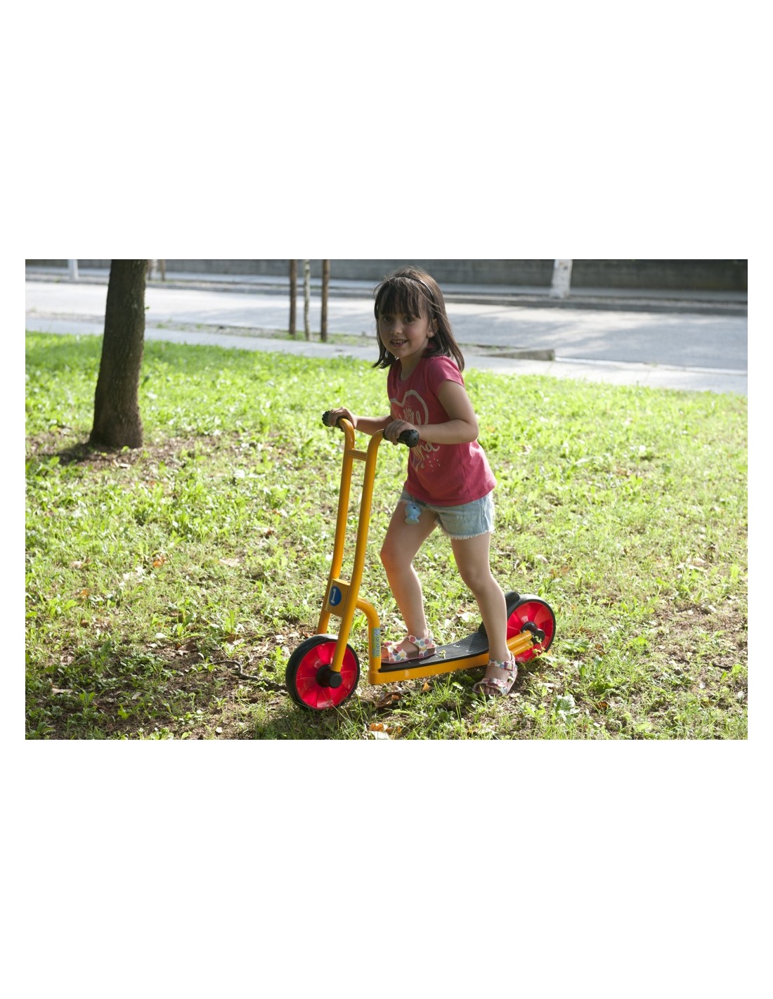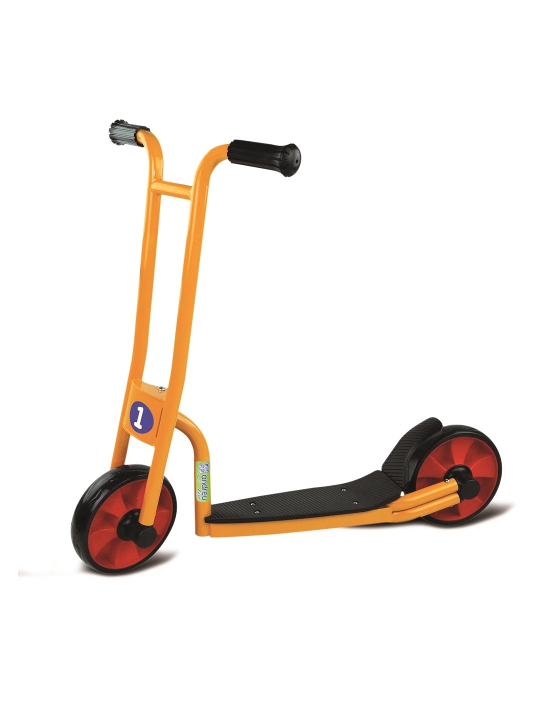 Patinete seguro y resistente especialmente diseñado para centros escolares y guarderías. Cumple con las normas EN71 de la CE. Es un patinete de fácil montaje. La pintura con la que está pintado es muy resistente a la corrosión y a los golpes. Aunque el triciclo pase días y noches en el patio no se dañará. En el centro de su chasis tiene un tubo de acero para el uso intensivo. Referente a las ruedas, no tienen radios, así que resistirán la fuerza de la abrasión. Ofrecemos un servicio de recambios y 2 años de garantía del cuadro y la horquilla.