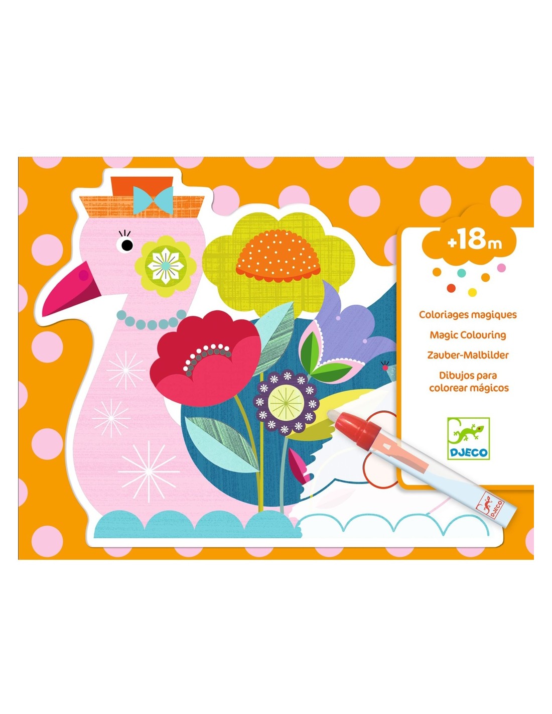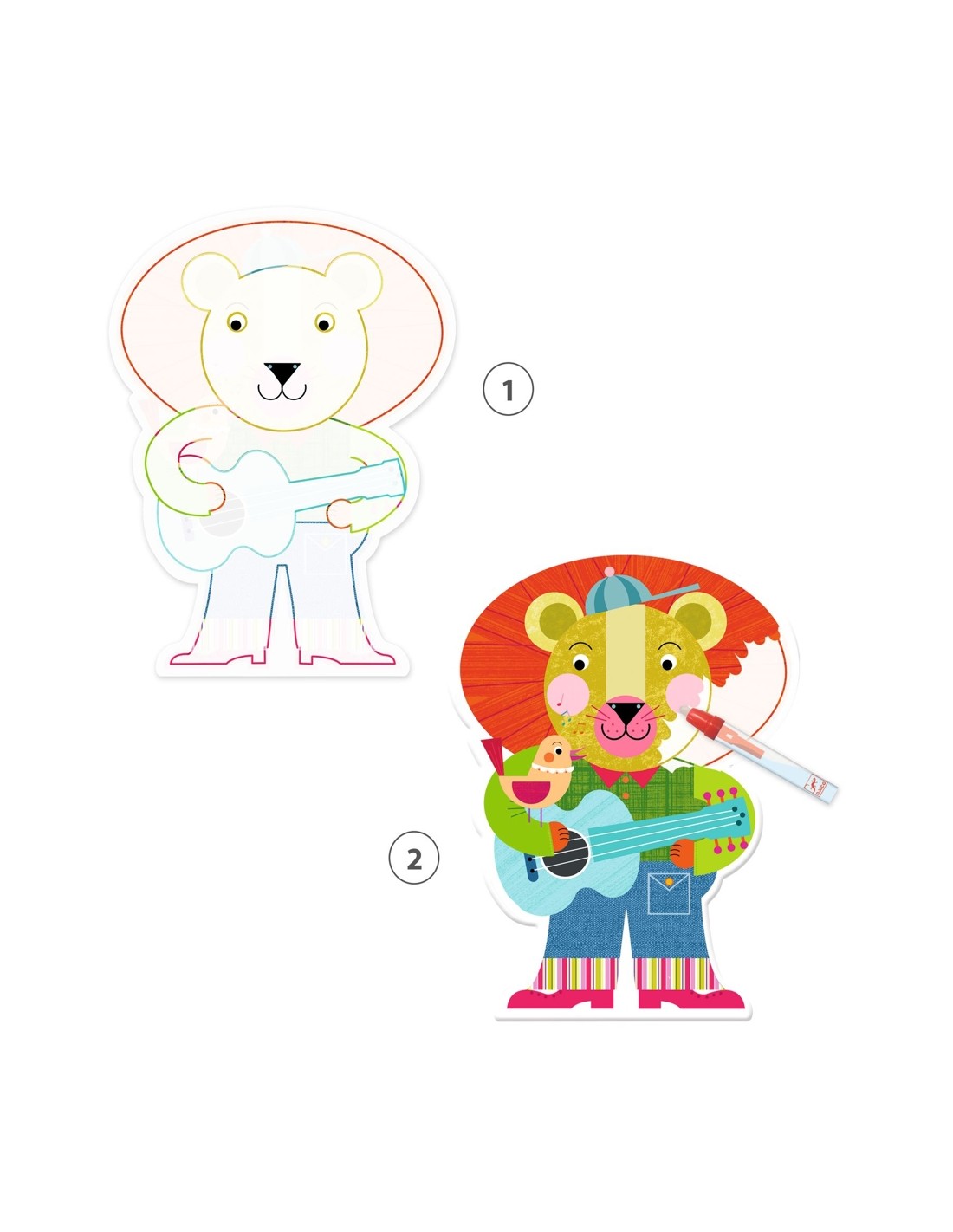 Esta actividad de Djeco para pintar con agua Animalo-Len, se invita a los pequeños y pequeñas a colorear los animales con el rotulador de agua para descubrir lo que se esconde debajo. ¡Aparecen patrones y cambian de color! ¡Magia!