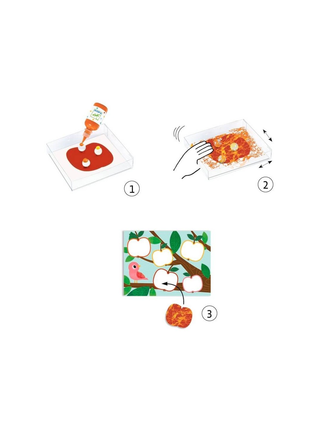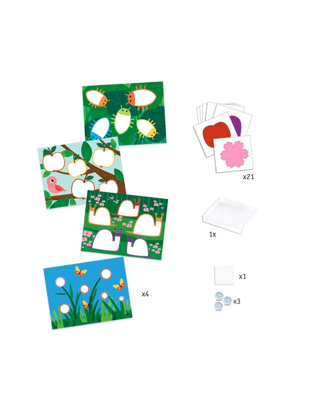 Dentro de la caja encontrarás 4 tarjetas de plantilla diferentes, 21 formas extraíbles para pegar, almohadillas adhesivas de doble cara, 4 botellas de acuarela altamente pigmentada de 30 ml, 1 recipiente transparente, 3 canicas e instrucciones paso a paso.