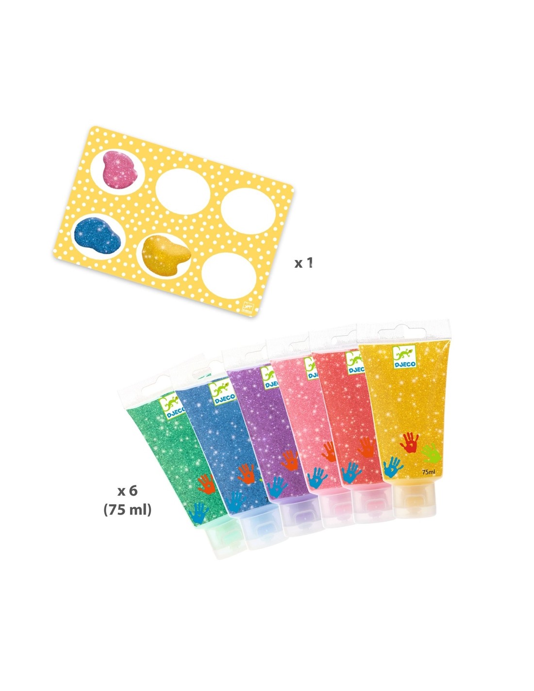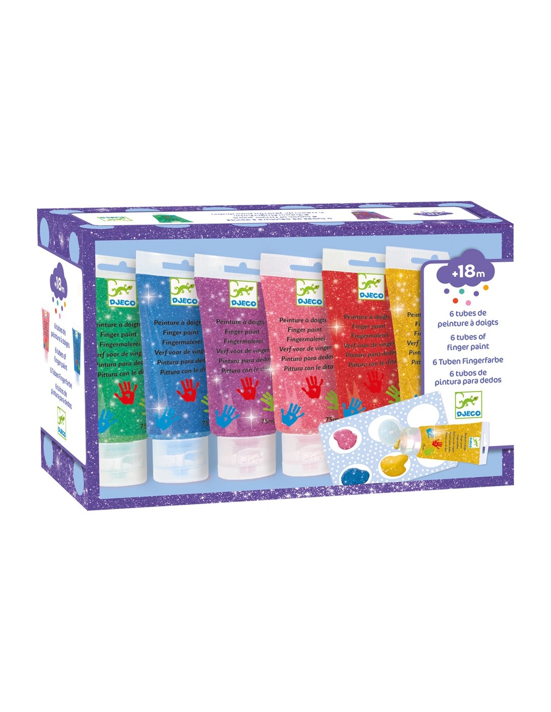 Contenido: 6 tubos grandes de pintura para dedos con purpurina (75 ml), 1 paleta de plástico (19,5 x 12,5 cm).