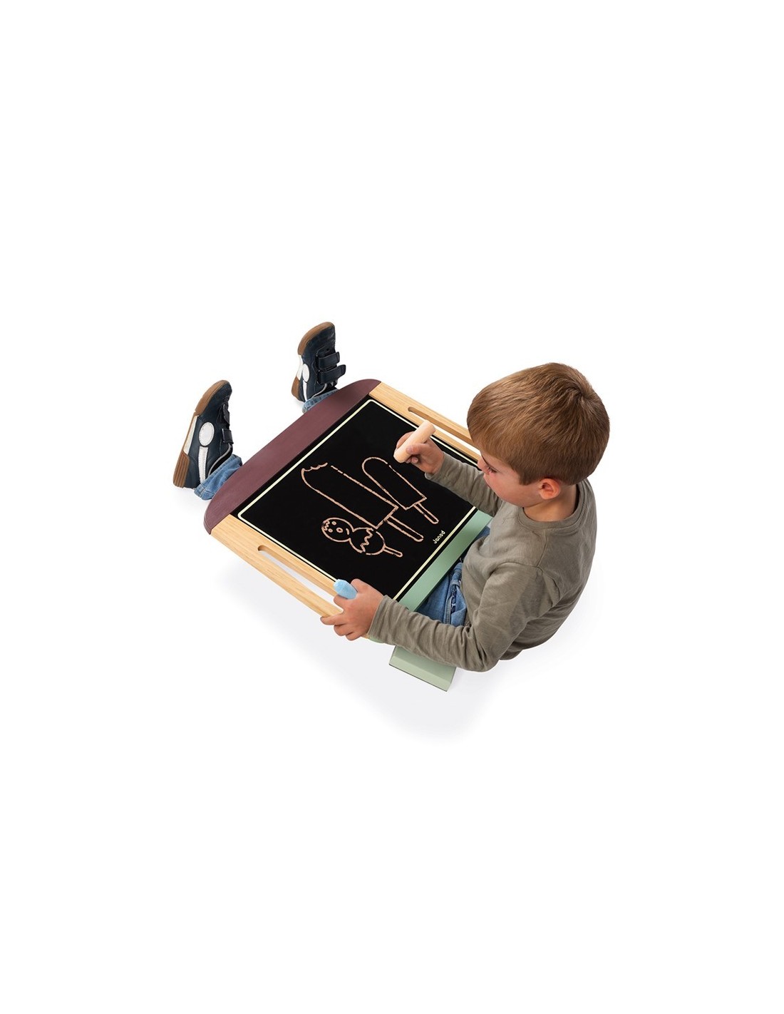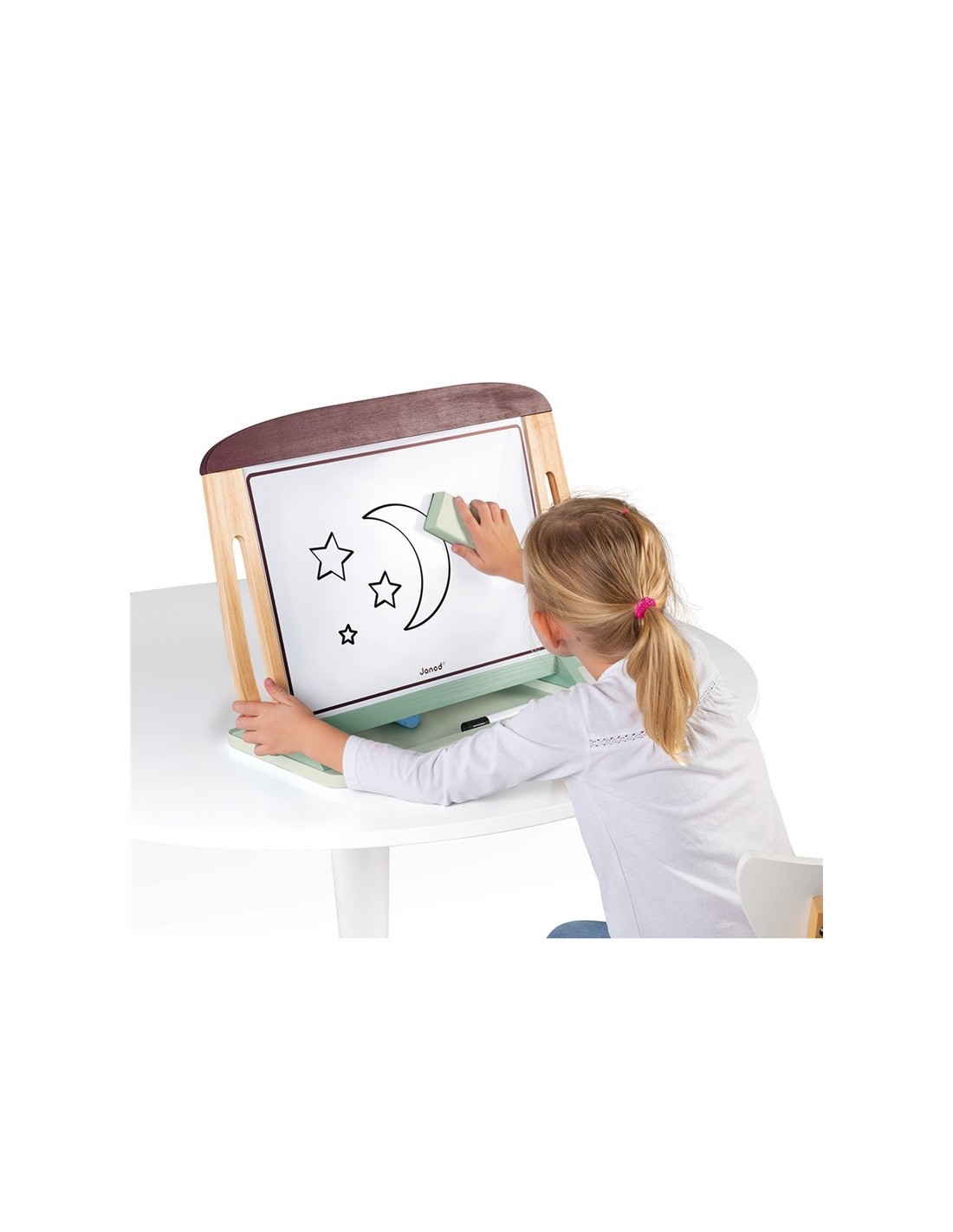 De la mano de Janod te traemos esta gran pizarra portátil, con dos caras, para dibujar en las distintas habitaciones de la casa. Se puede llevar y colocar fácilmente sobre su soporte antideslizante. Cuenta con una cara de pizarra negra para las tizas y una cara de pizarra blanca para el rotulador borrable. Incluye 2 tizas gruesas, 1 rotulador borrable y un borrador.