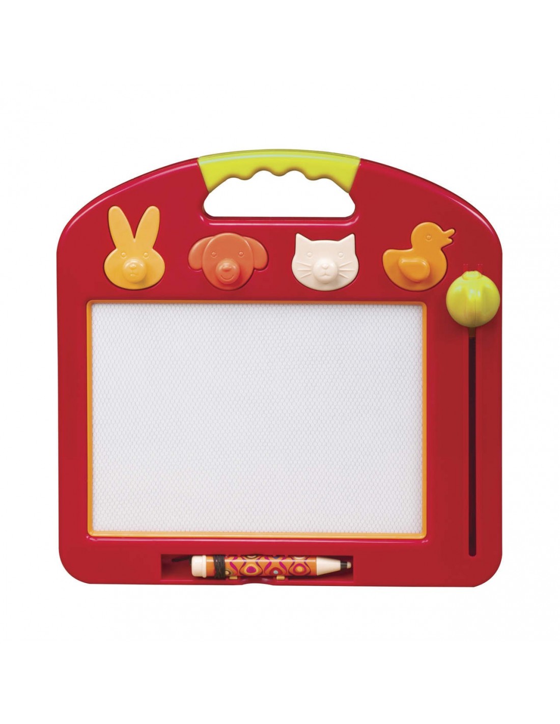 Pizarra mágica para dibujar sin parar una y otra vez. Se trata de una pizarra magnética que se borra pasando el botón lateral de arriba a bajo. Se dibuja con el lápiz que incluye y también se pueden hacer formas con los tampones que incluye: el tampón de conejo, el tampón perro, el tampón gato y el tampón pato. También incluye un cojín para ponerte en la falda y dibujar cómodamente estés donde estés. ¡Saca todo tu arte!