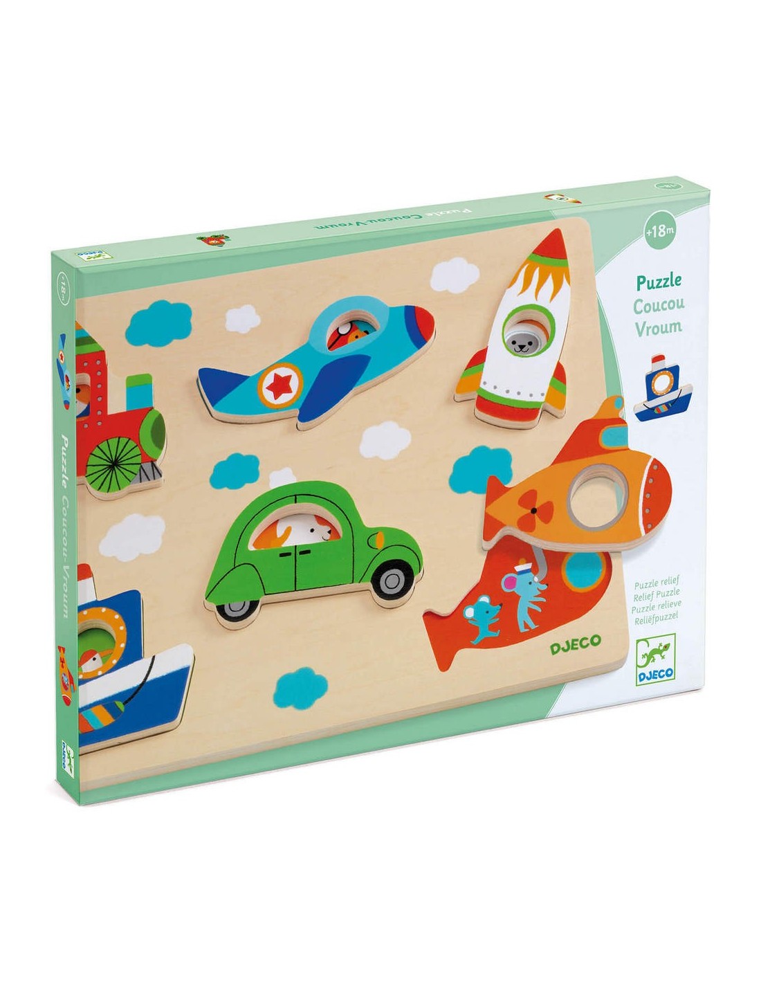 Descubre el puzle en relieve de Coucou-Vroum de Djeco, un magnífico rompecabezas de madera de 6 piezas para niños a partir de 18 meses con temática de vehículos. Debajo de cada una de las piezas con forma de vehículo hay una ilustración de personajes. Al quitar una pieza, los peques descubrirán quién conduce el vehículo.