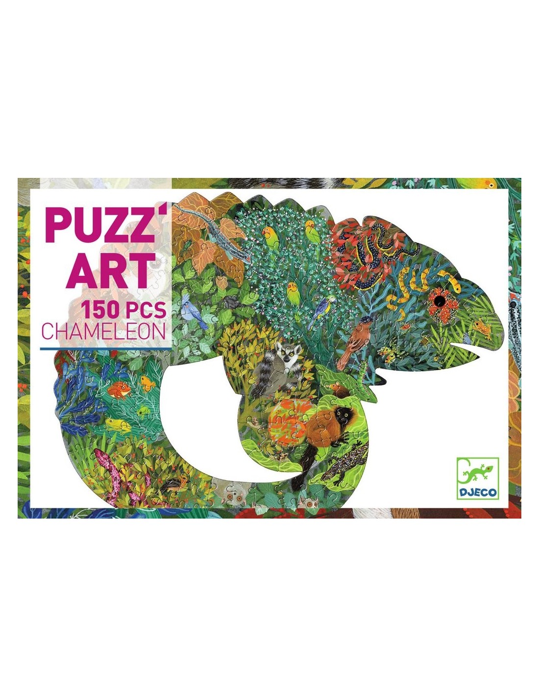 Este puzle de Djeco es súper original debido a su forma sin bordes y a la ilustración tan colorida y llena de vida que presenta. ¡Fíjate, dentro del camaleón hay otros animales y plantas! De 150 piezas, este juguete servirá para que mejores tu habilidad manual y para que, si quieres, lo disfrutes en familia. ¡Aprende mientras juegas!