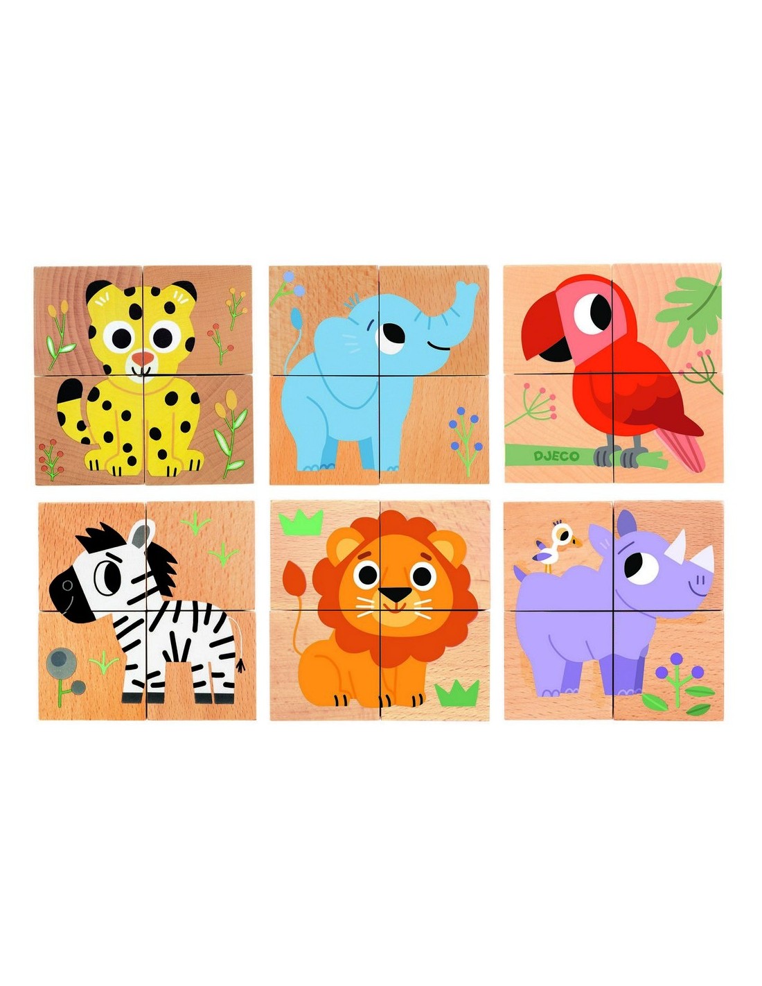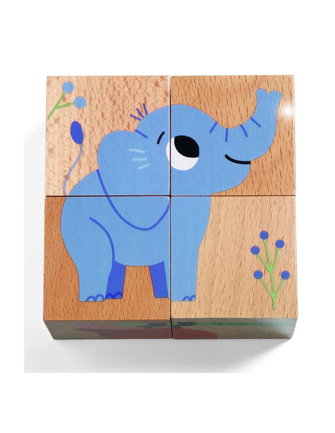 Te presentamos el puzle de madera Wild & Co de Djeco, formado por 4 cubos de madera que permitirán a los niños y niñas recomponer 6 imágenes con preciosos y adorables animales salvajes: 1 elefante, 1 león, 1 loro, 1 rinoceronte, 1 cebra y 1 leopardo.