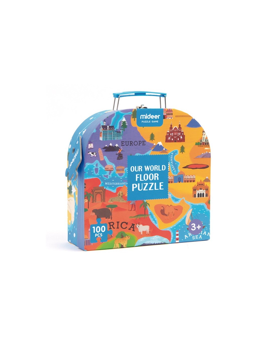 Puzle mapamundi de 100 piezas que incluye una guía para facilitar el proceso, para que los peques vayan familiarizándose con el mapa del mundo y aprendiendo poco a poco sus países. Tamaño del puzle montado: 87cm x 46cm.