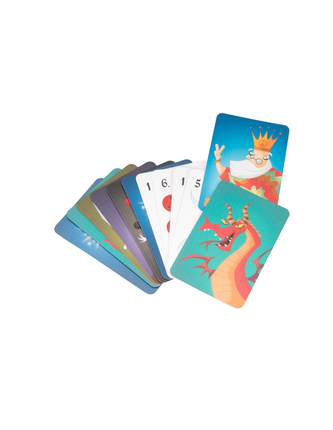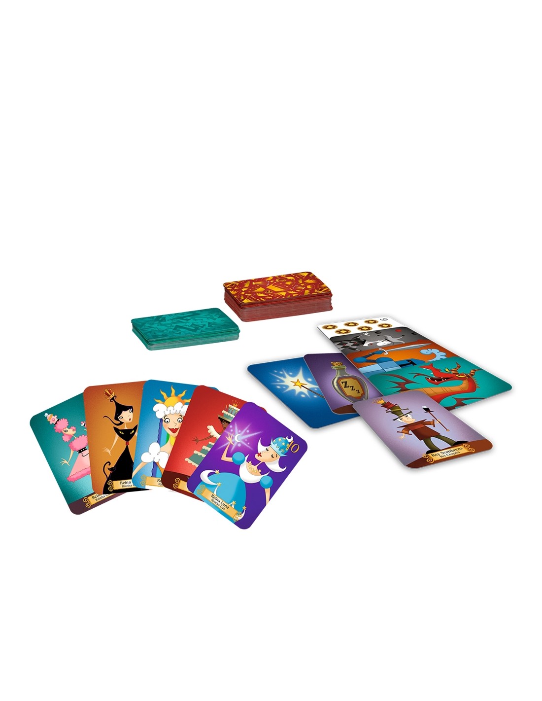 El juego comienza colocando las cartas verdes como se indica y barajando las cartas rojas, repartiendo 5 a cada jugador. Durante cada turno, los jugadores pueden jugar una carta especial o descartarse de cartas de puntos. Las cartas especiales incluyen 7 tipos diferentes: Reyes, Caballeros, Dragones, Somníferos, Varitas Mágicas y Bufones. Cada una de estas cartas tiene una función única que puede ayudar al jugador a avanzar hacia su objetivo o a obstaculizar a sus oponentes.