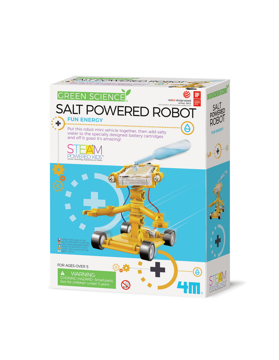 No todos los robots funcionan con electricidad... ¡Este funciona con sal! Sí, lo has leído bien. Con este juego de ciencias de la marca 4M podrás construir un robot que empezará a circular cuando le eches agua con sal. El juego te ofrece todo el material necesario para que lo puedas construir. Además, incluye un folleto paso a paso para que puedas construirlo siguiendo las instrucciones. Una vez construido, échale agua y disfruta viendo como se mueve tu creación.