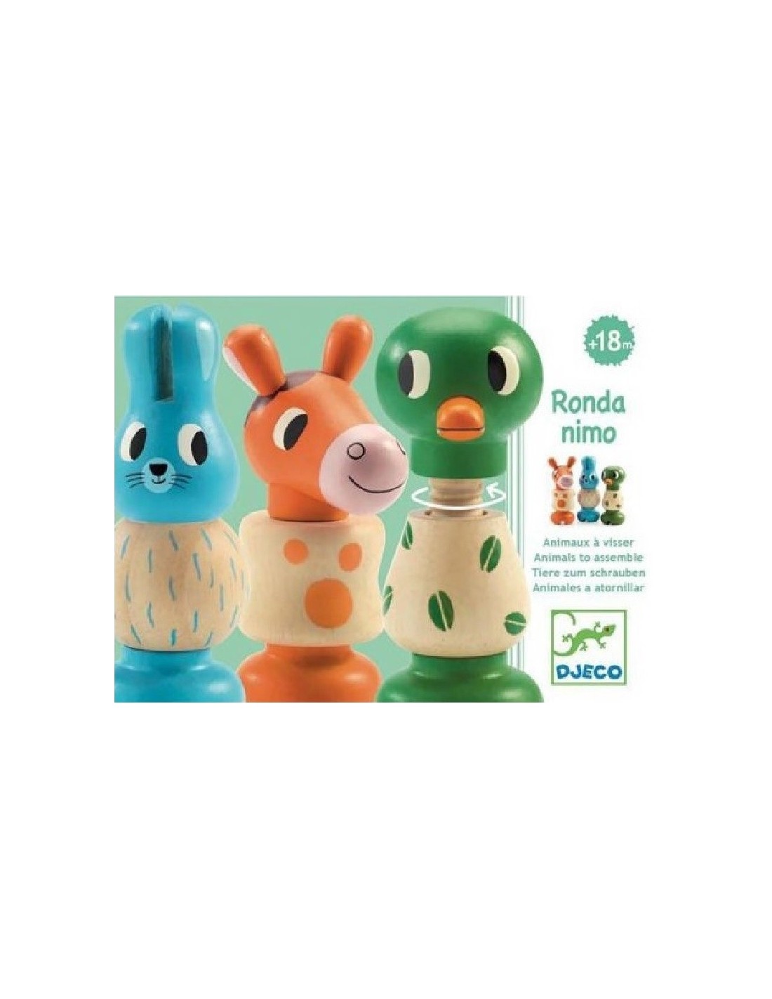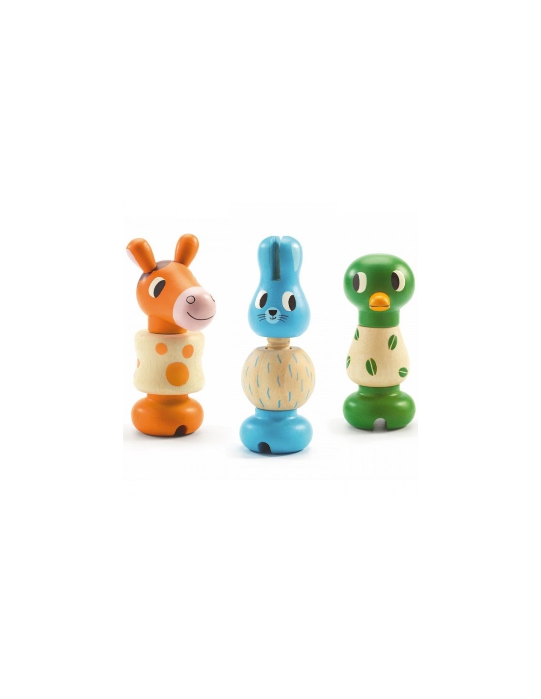 Presentamos este bonito juego de manipulación fabricado por la marca de juguetes Djeco. El objetivo es que el niño o la niña construyan los tres animales por sí solos. Cada uno está formado por tres piezas de madera que se atornillan con las manos y que se pueden intercambiar entre sí. De este modo, los más pequeños aprenden a reconocer y asociar los colores al tiempo que aprenden los nombres de estos tres animales.