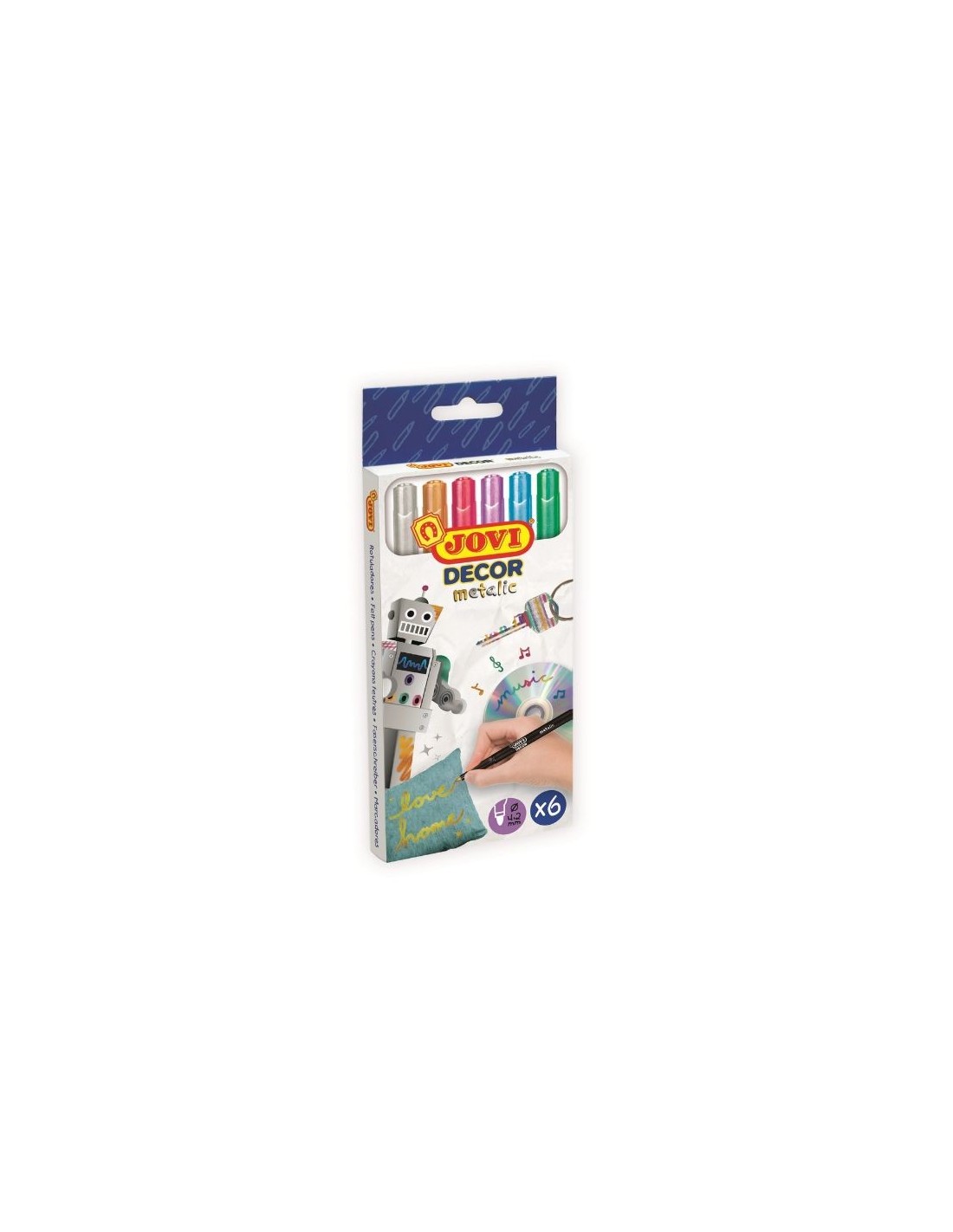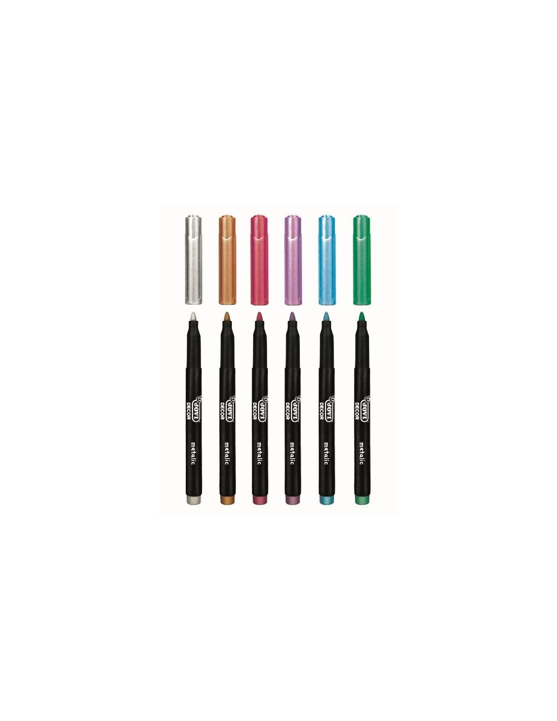 Te presentamos este genial pack de 6 rotuladores metalizados de colores surtidos, de la mano de la reconocida marca Jovi y perteneciente a su línea JOVIDECOR. Plateado, dorado, rojo, lila, azul y verde. ¿Cuál te gusta más? ¡Podrás usarlos todos para crear un súper dibujo ! Seguro que sorprendes a tus famiiliares y amiguitos y quedan maravillados con tus dotes artísticos. Tal vez puedes regalarles un dibujo de lo más futurista… ¿Te animas?