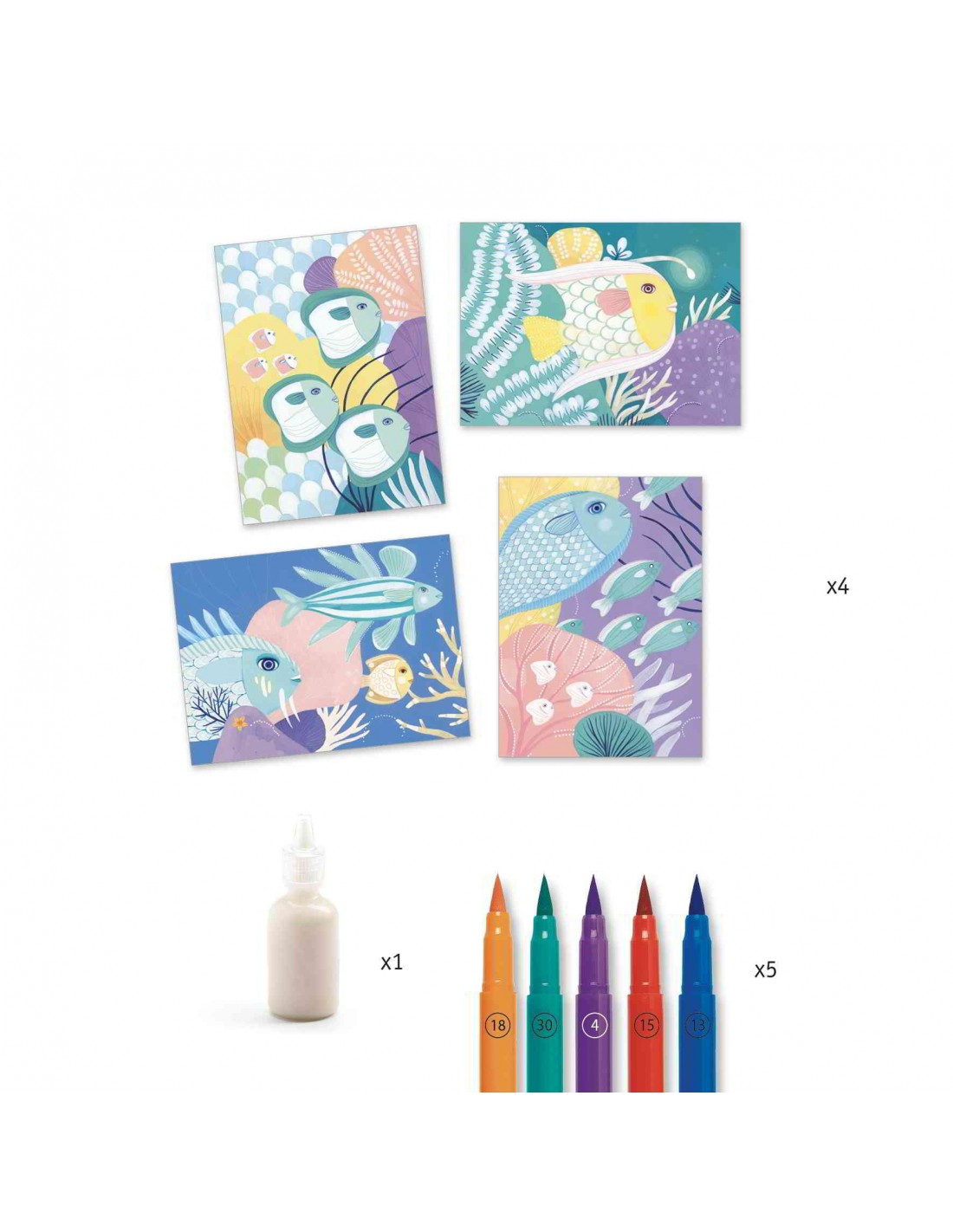 De la mano de Djeco, una de nuestras marcas de confianza, te traemos este pack Rotuladores pincel Bajo el Mar, para los artistas de la casa. El set contiene 4 originales láminas de cartulina dura, 8 rotuladores profesionales con pincel en un lado para áreas más grandes y con punta afilada para dibujo detallado e instrucciones detalladas ilustradas.