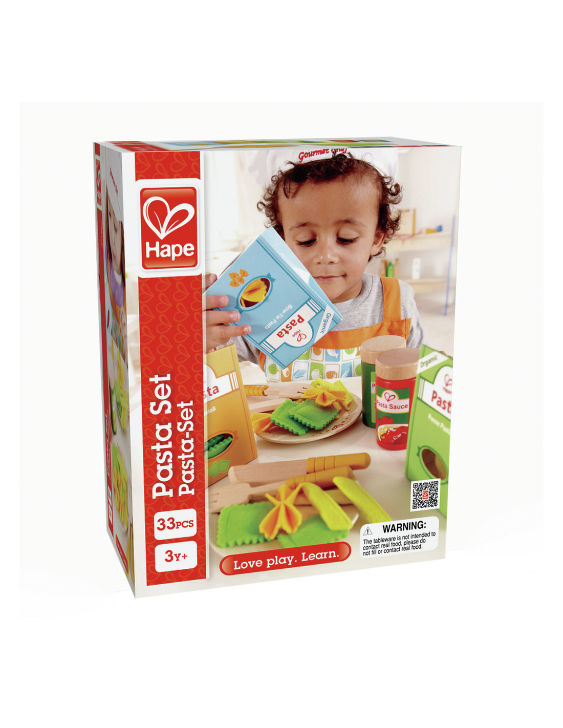 Un set muy original que va a sorprender a todos los buenos gourmets y cocineros. Consiste en un conjunto para comer pasta. En el juego encontrarás: 2 platos de madera, 2 tenedores de madera, un bote de queso parmesano, un bote de tomate frito, una caja de macarrones, una caja de lacitos y una caja de raviolis. No necesitas nada más para preparar un buenísimo plato de pasta. El set está hecho de madera, tela y plástico y es un complemento perfecto para un set de utensilios de cocina y una cocina.