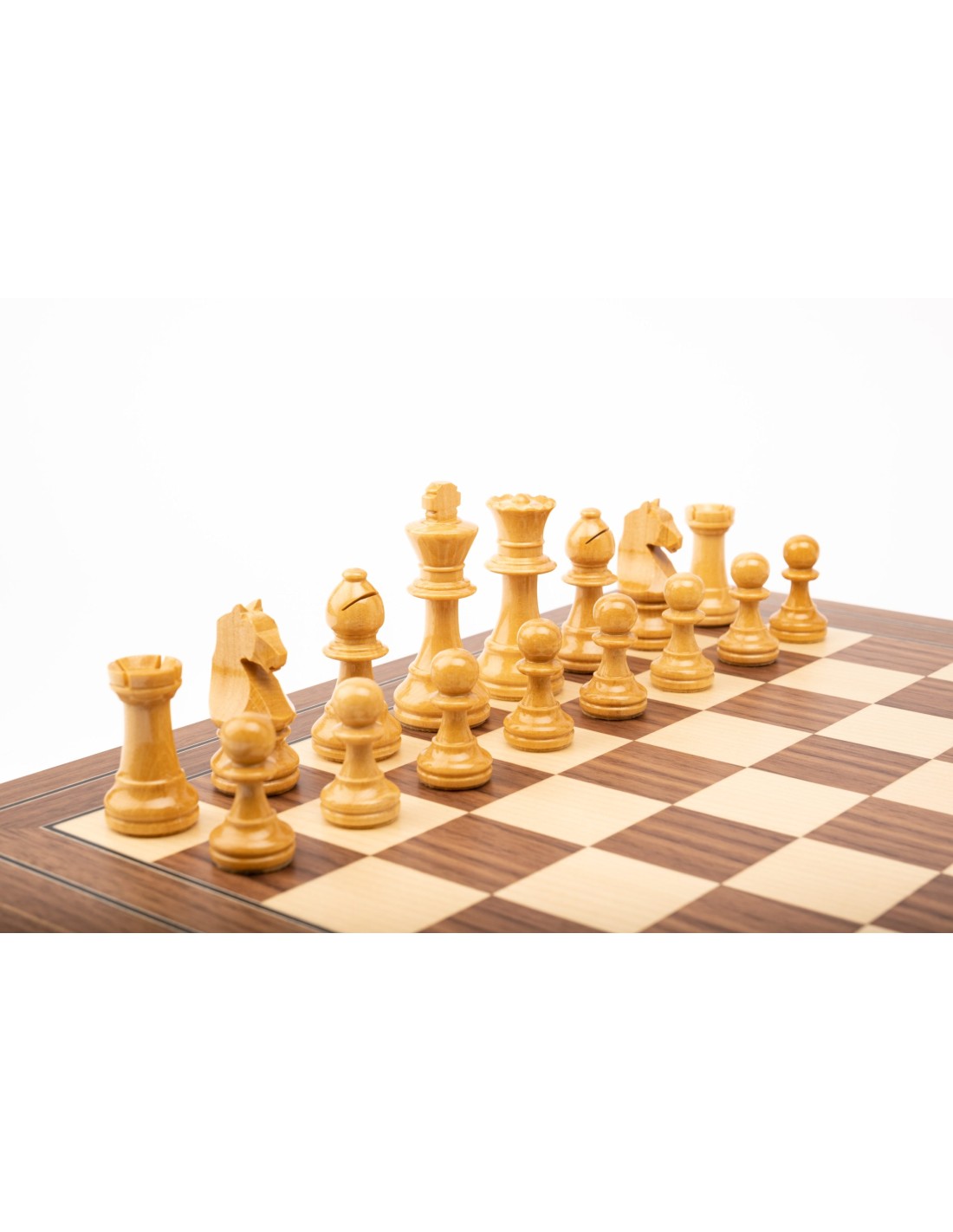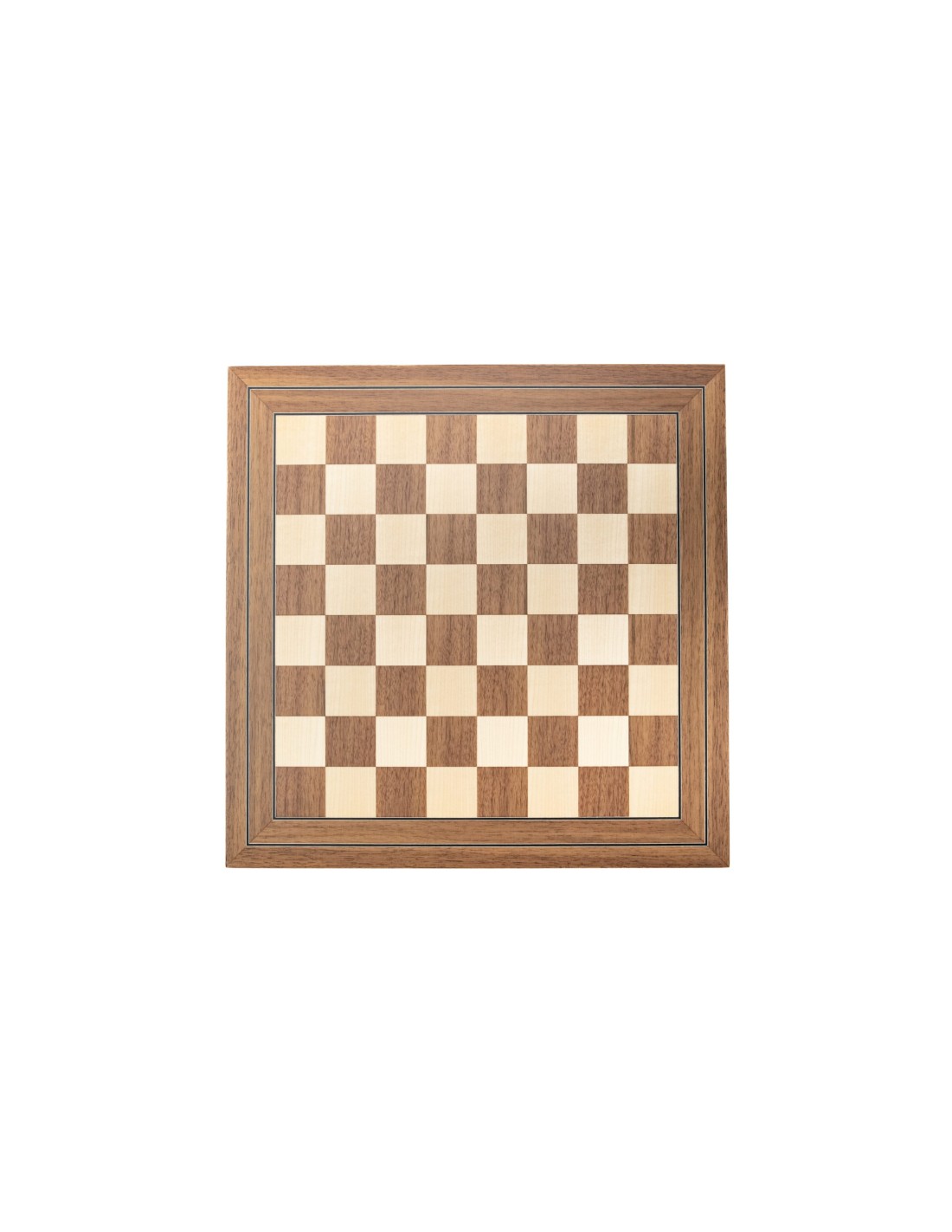 Su superficie está realizada con auténticas chapas de madera, donde las casillas claras están elaboradas en sicómoro y las oscuras en nogal. El marco exterior también es de nogal e incorpora un refinado detalle de doble cadeneta que aporta un toque decorativo exclusivo y diferenciador. El acabado mate evita reflejos indeseados y permite una experiencia de juego más cómoda y agradable.