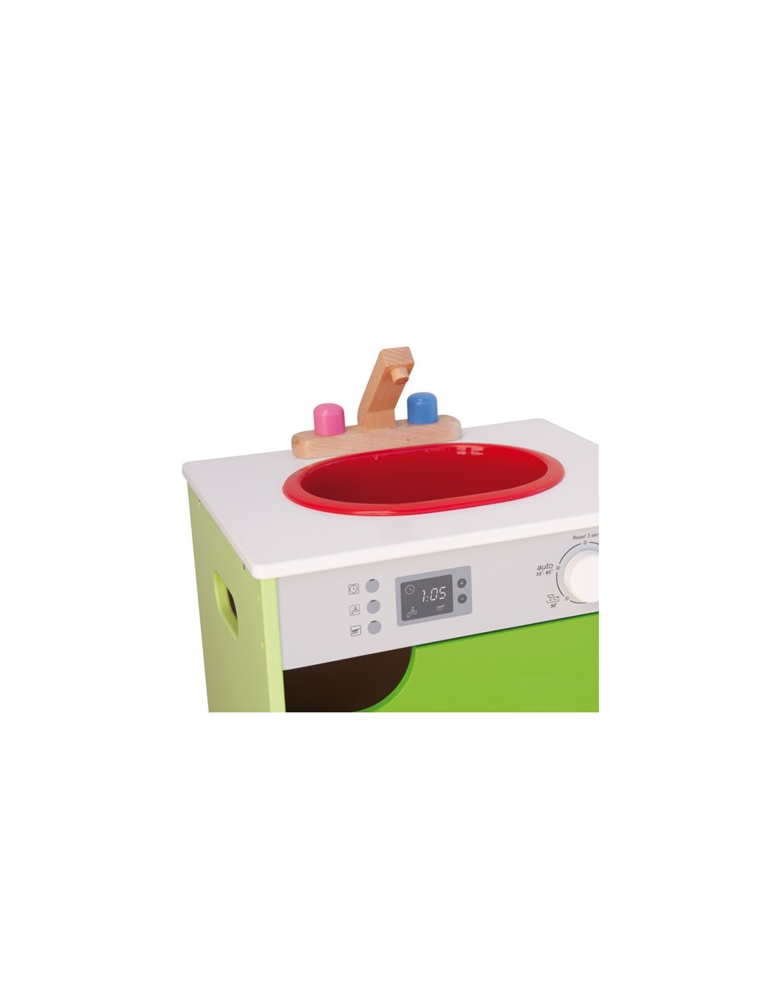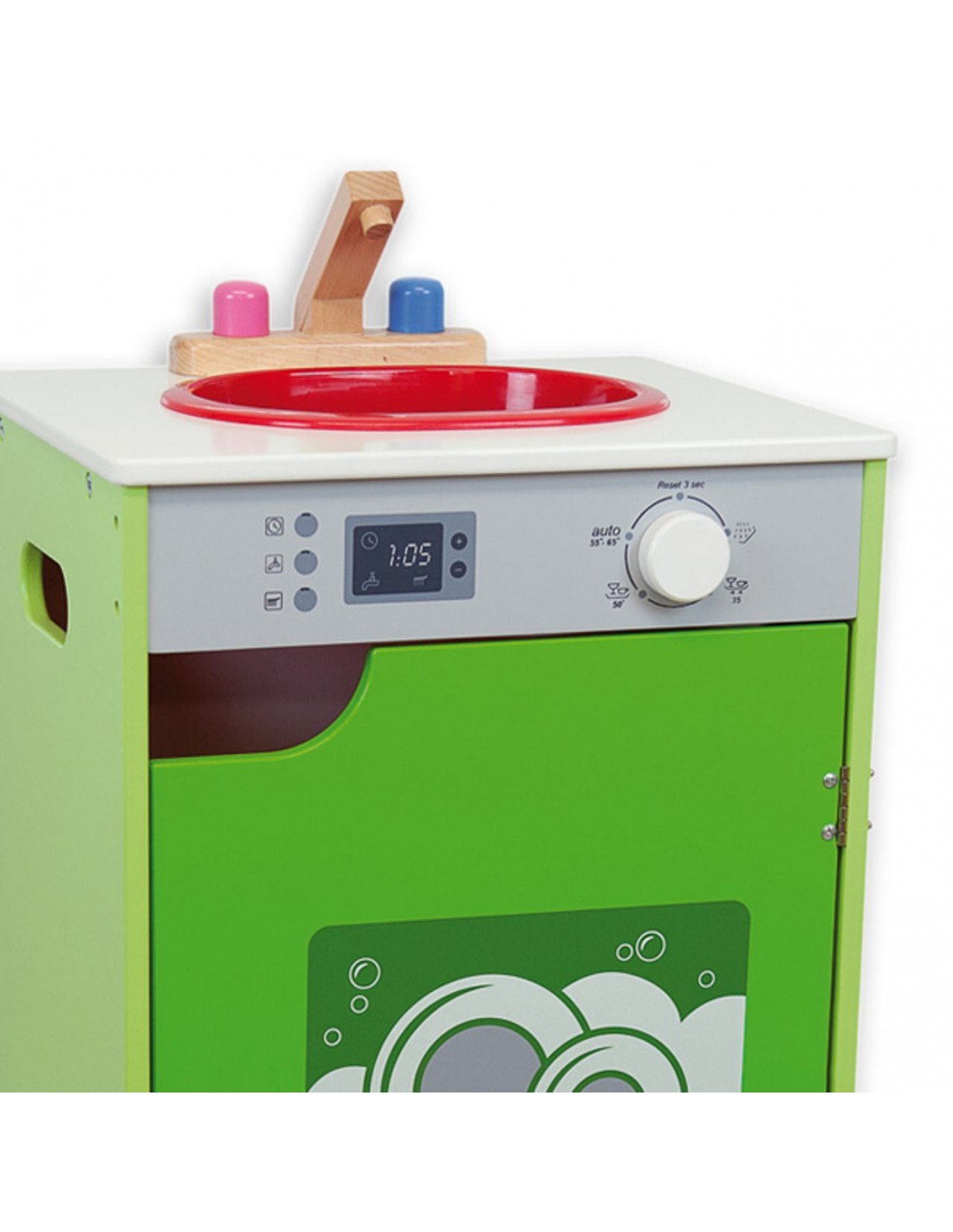 Fregadero de juguete y de madera con el que podrás lavar tus platos y cubertería a mano o a máquina. Está hecho de madera, es muy compacto y está pintado con una combinación de colores realmente bonita. Tiene un armario para guardar las cosas que representa la puerta del lavaplatos, ya que en la parte superior hay los botones para seleccionar el programa. ¡Un juguete simbólico perfecto!