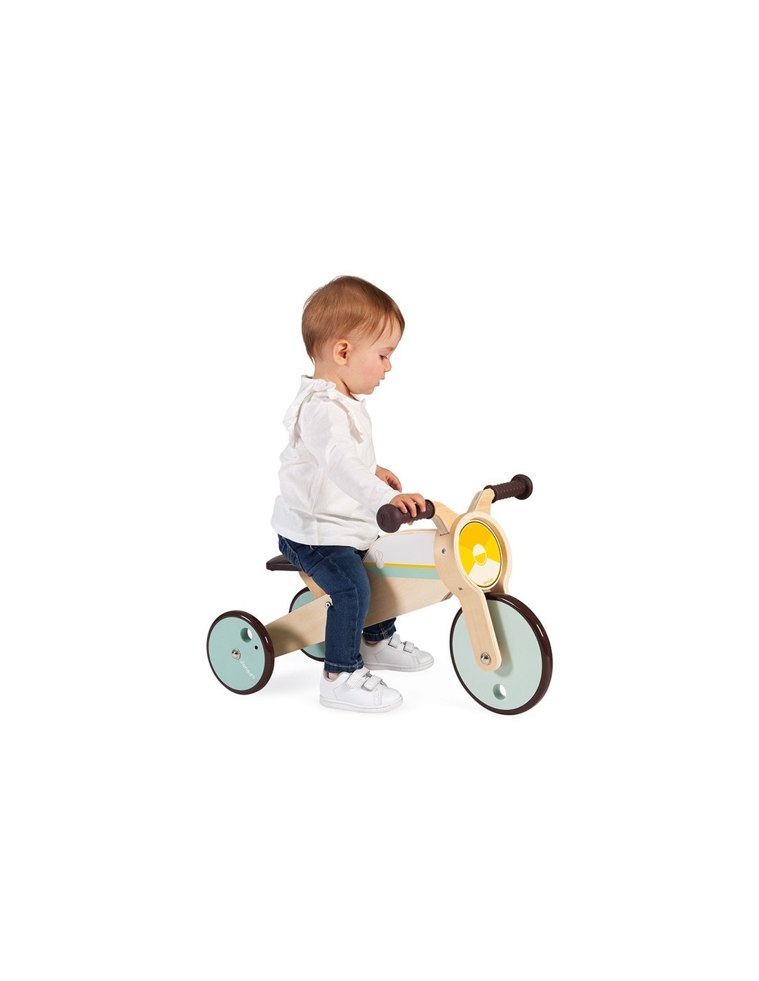 ¿Cómo? ¡Pasando de ser un juguete balancín a un triciclo normal! Este juguete de madera se transforma rápidamente gracias a su balancín desmontable que, una vez retirado, da paso a un pequeño triciclo de look retro.