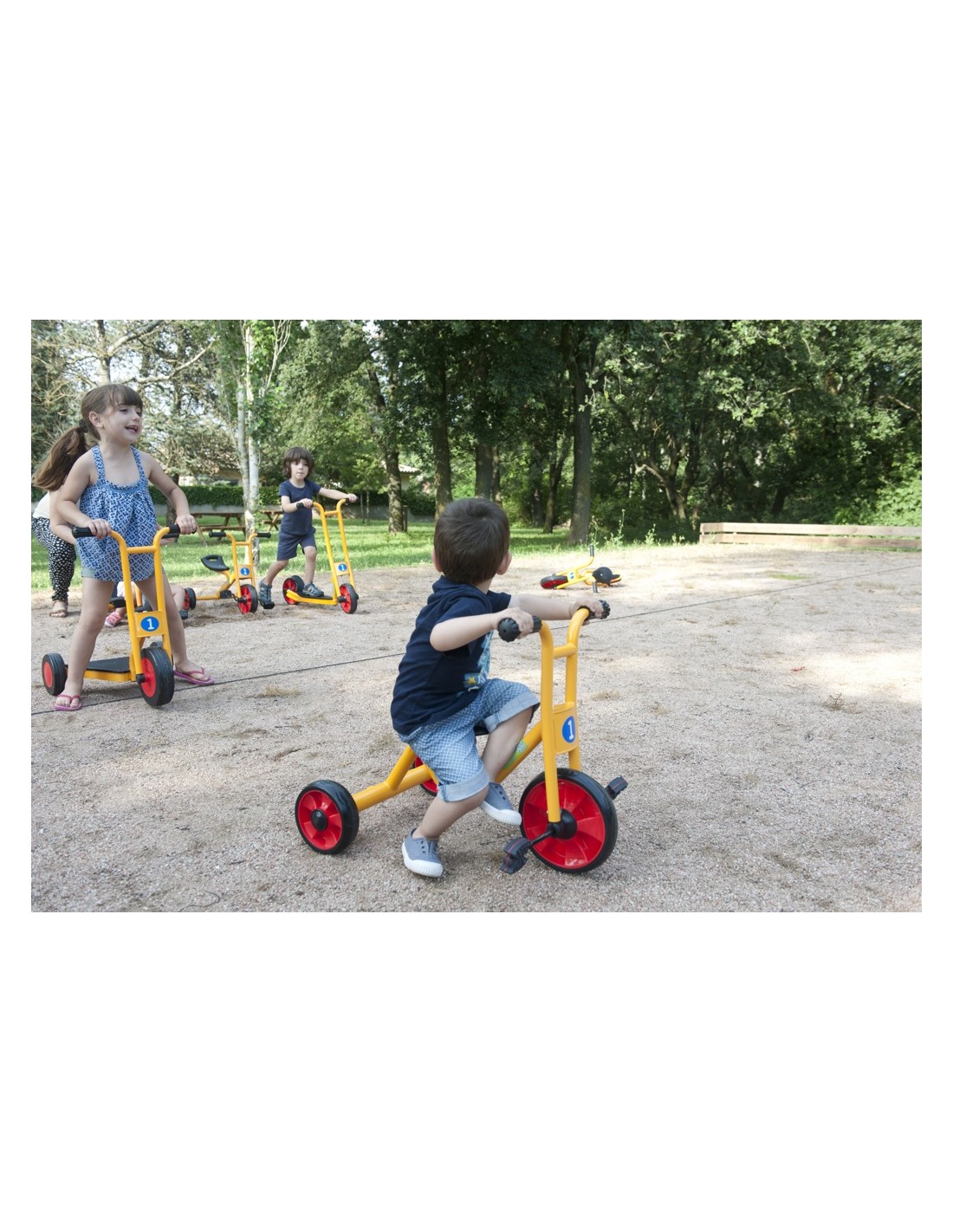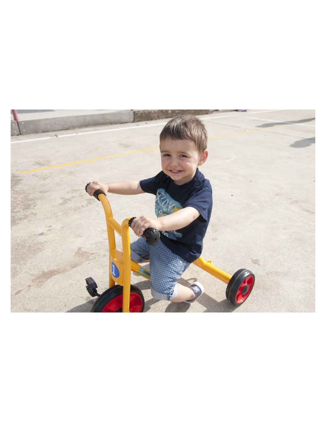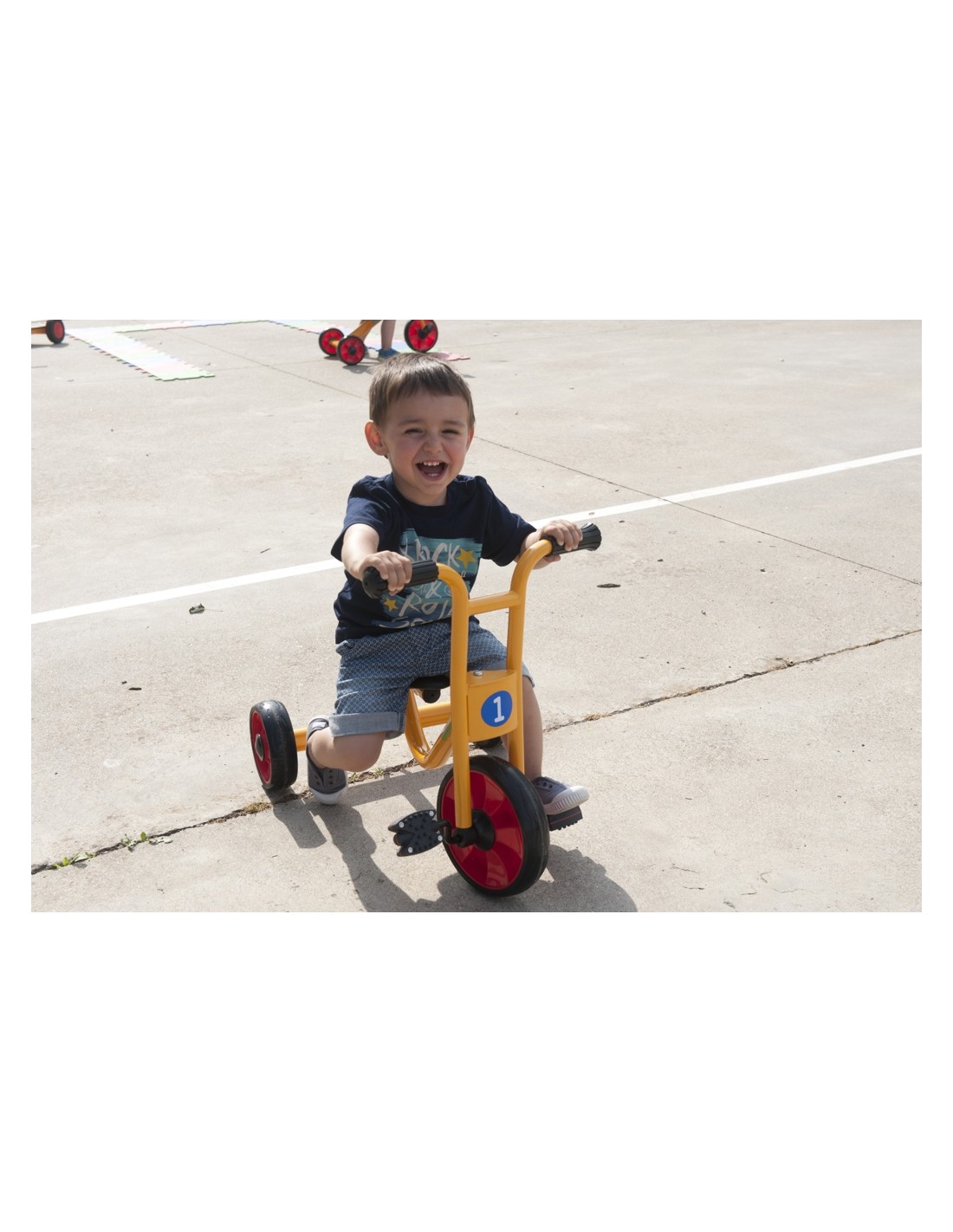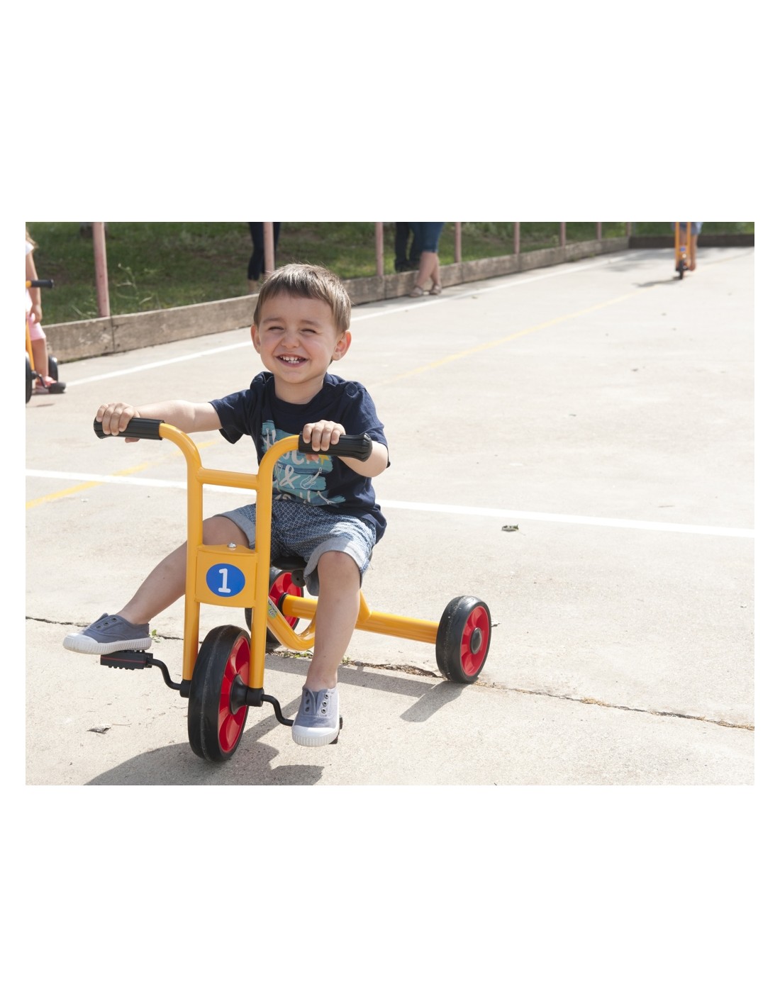 Triciclo seguro y resistente especialmente diseñado para centros escolares y guarderías. Cumple con las normas EN71 de la CE. Es un triciclo de fácil montaje. La pintura con la que está pintado es muy resistente a la corrosión y a los golpes. Su asiento es anatómico y está hecho de polietileno, así que aguantará perfectamente la intemperie. Aunque el triciclo pase días y noches en el patio no se dañará. En el centro de su chasis tiene un tubo de acero para el uso intensivo. Los pedales de este triciclo son antideslizantes y su eje y su soporte están hechos de una sola pieza de acero. Referente a las ruedas, no tienen radios, así que resistirán la fuerza de la abrasión. Ofrecemos un servicio de recambios y 2 años de garantía del cuadro y la horquilla.