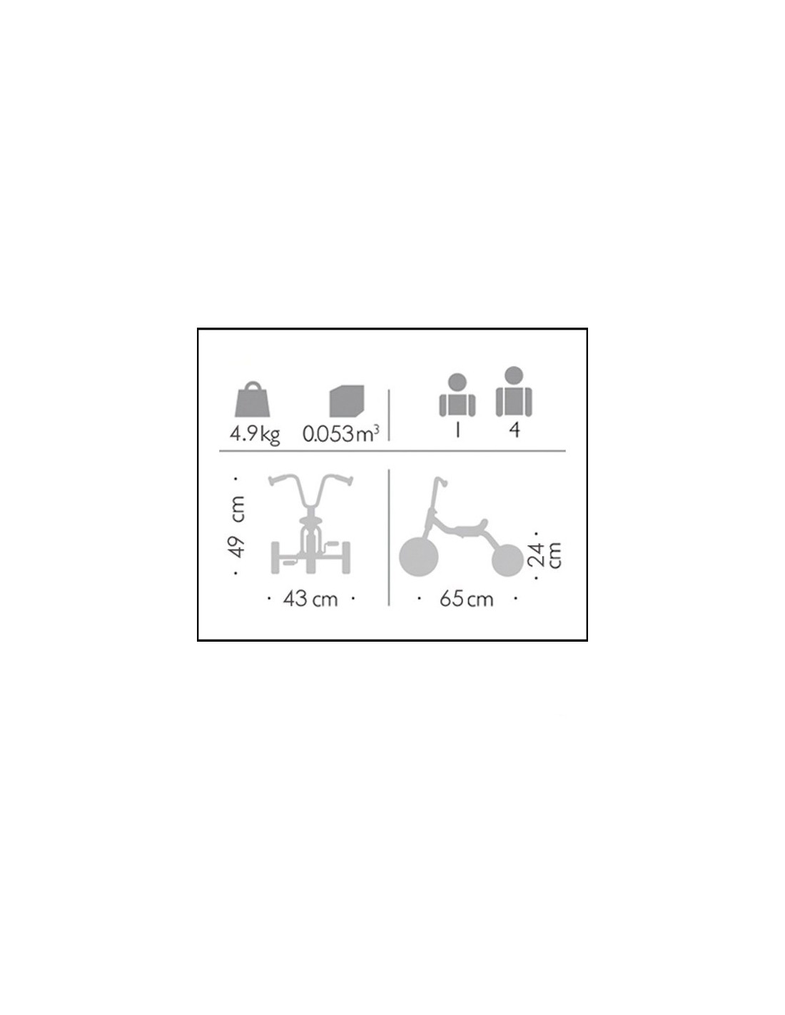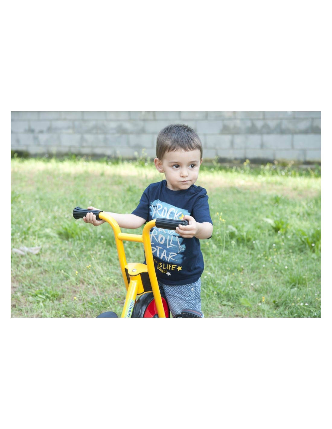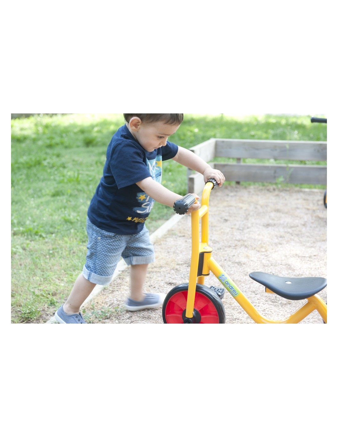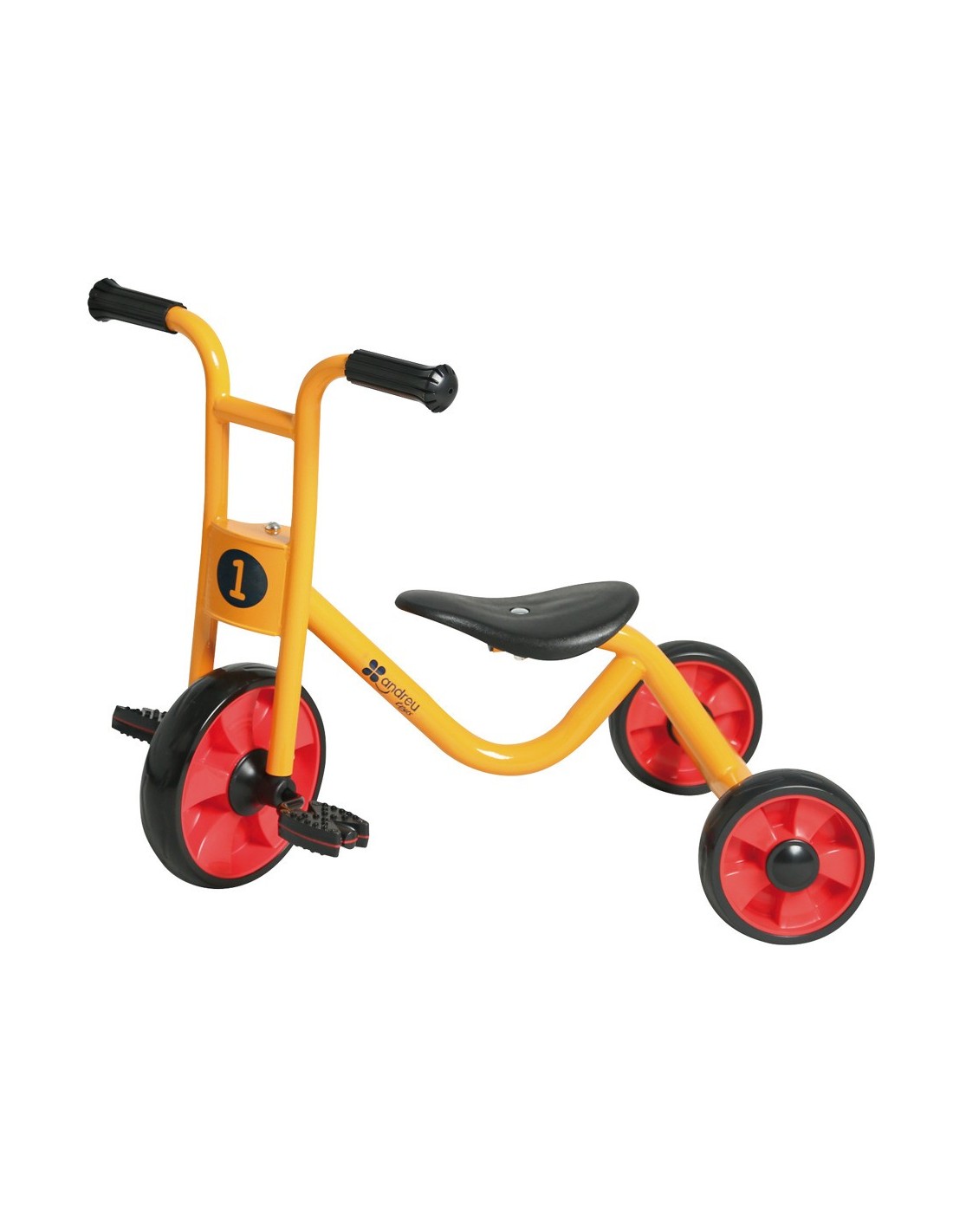 Triciclo seguro y resistente especialmente diseñado para centros escolares y guarderías. Cumple con las normas EN71 de la CE. Es un triciclo de fácil montaje. La pintura con la que está pintado es muy resistente a la corrosión y a los golpes. Su asiento es anatómico y está hecho de polietileno, así que aguantará perfectamente la intemperie. Aunque el triciclo pase días y noches en el patio no se dañará. En el centro de su chasis tiene un tubo de acero para el uso intensivo. Los pedales de este triciclo son antideslizantes y su eje y su soporte están hechos de una sola pieza de acero. Referente a las ruedas, no tienen radios, así que resistirán la fuerza de la abrasión. Ofrecemos un servicio de recambios y 2 años de garantía del cuadro y la horquilla.