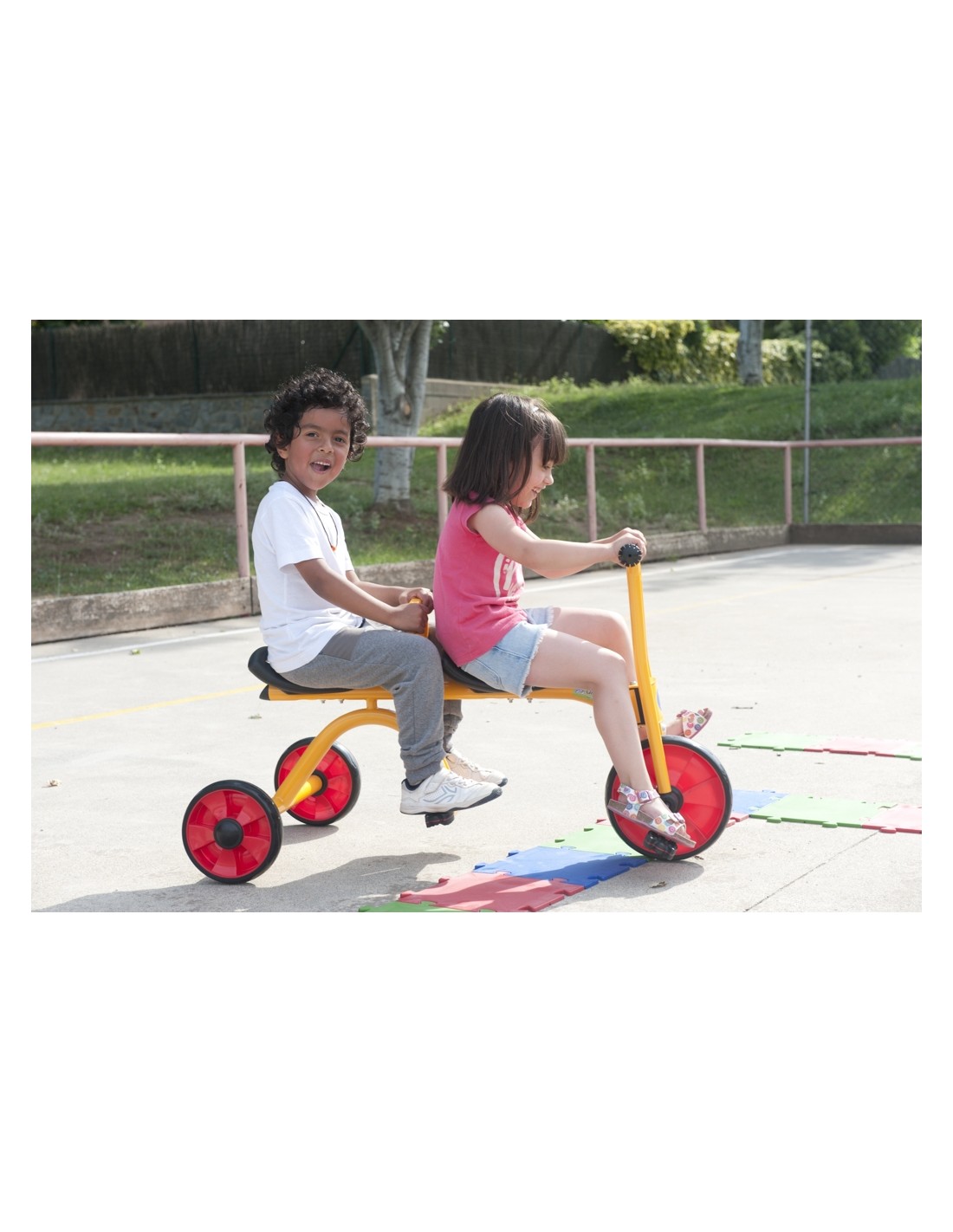 La marca de juguetes Andreu Toys presenta su última novedad en bicicletas infantiles: El Taxi. Su estructura fabricada en metal proporciona una estabilidad muy sólida y está pensada para resistir todas las aventuras de los niños. Además, incluye un soporte central sobre el que apoyar los pies y que trasmite confianza al pasajero de atrás. Cumple con las normas EN71 de la CE y es un patinete de fácil montaje. Su pintura es muy resistente a la corrosión y a los golpes de modo que aunque el triciclo pase días y noches en el patio no se dañará. En el centro de su chasis tiene un tubo de acero que refuerza la estructura, pensada para el uso intensivo. Se han eliminado los radios de las ruedas para fortalecer la resistencia a la fuerza de la abrasión. Ofrecemos un servicio de recambios y 2 años de garantía del cuadro y la horquilla. Ideal para niños y niñas entre 3 y 7 años, este taxi está hecho para durar y para acompañar a los niños durante incontables horas de diversión.