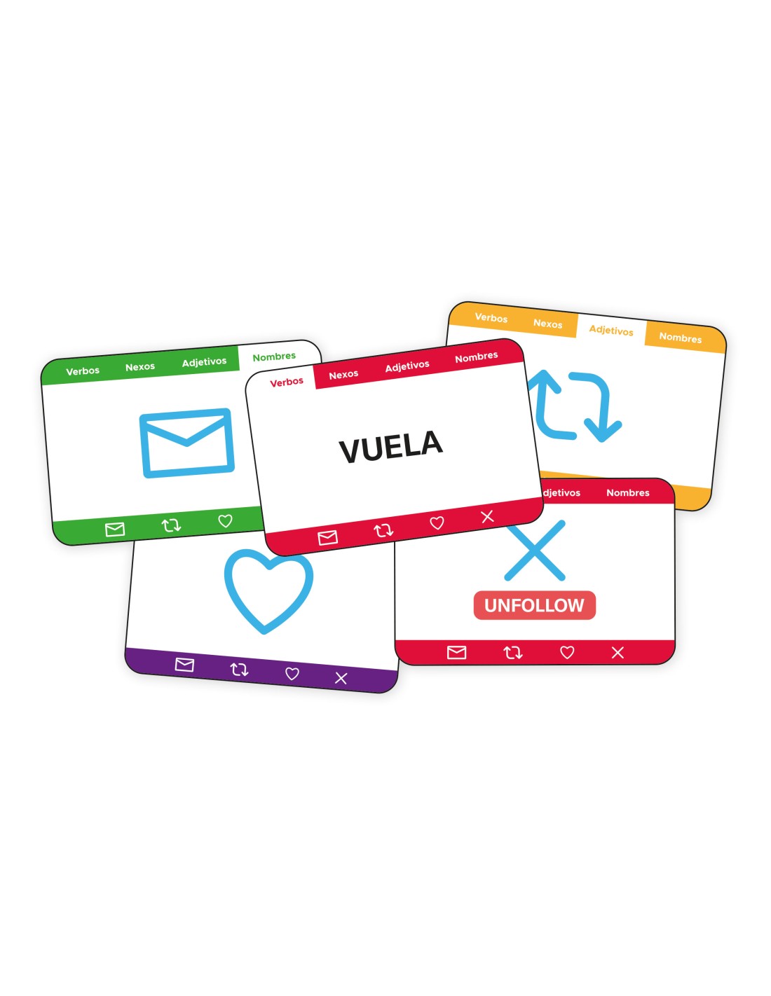 En Unfollow, cada jugador debe construir frases encadenadas a partir de las cartas del centro de la mesa, manteniendo la coherencia y sin equivocarse. Puede parecer sencillo, pero conforme el hilo crece, también aumenta la confusión. ¿Podrás mantener la concentración y no quedarte con todas las cartas?